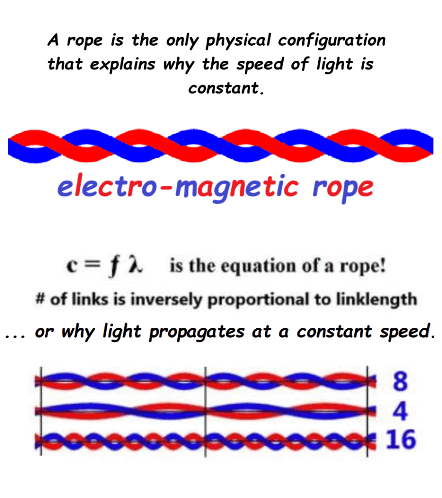 Light consists not of slow, one-way transverse or longitudinal waves, but of the fastest thing imaginable to Man: a bidirectional 3D torsion ‘wave’. Light is so fast because the rope goes nowhere. It torques in situ. All atoms in existence are physically interconnected via EM ropes. There is no action at a distance. It’s that Mother Nature made the mediators invisible and intangible.
